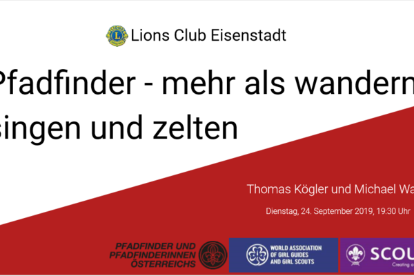 Auf Einladung des Lions Club Eisenstadt referierten am 24.9.2019 der Obmann und Gruppenleiter der Pfadfindergruppe Eisenstadt, Dipl.-Ing. Thomas Kögler und Michael Wapp, über die Geschichte der Pfadfinder, die Pfadfindermethode und deren Umsetzung, den Verhaltenskodex, das Pfadfindergesetz sowie die Ziele der Pfadfinder und gaben Einblick in die Arbeit der Gruppe Eisenstadt.