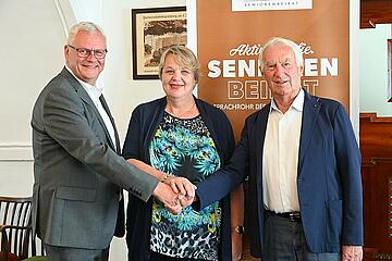 Bürgermeister Thomas Steiner mit dem scheidenden und der neuen Vorsitzenden des Seniorenbeirates, Hans Skarits und Adelheid Hahnekamp